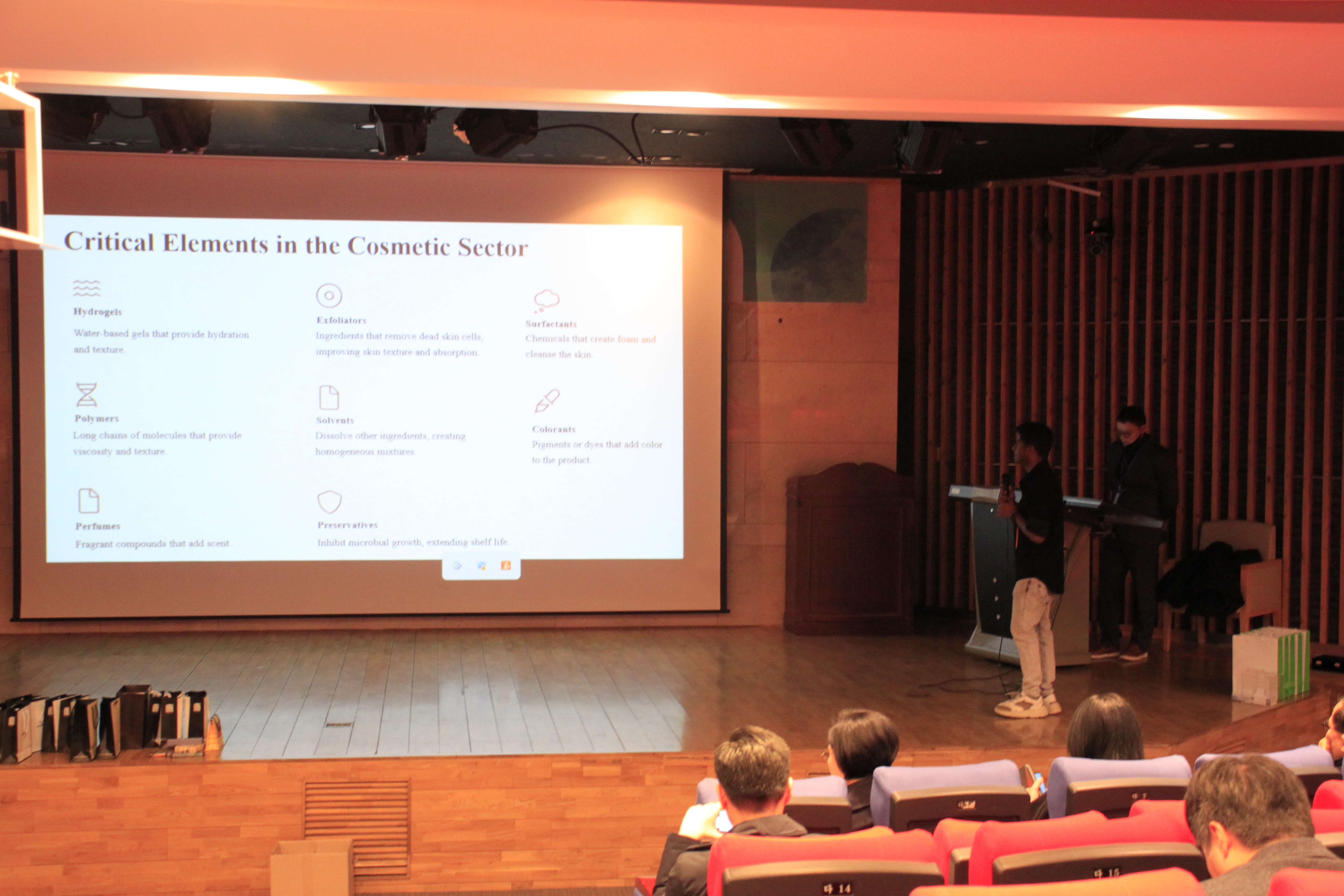 본격적인 제12차 추계학술발표대회 구두 발표는 △김인영 박사 ‘겔네트워크 공법을 이용한 안정화 산소수 개발을 위한 산소화장품 공업화’ △Anandhu Mohan(인도) ‘Recent Advances in the Synthesis and Characterization of Bio-Derived Activated Carbon for Cosmetic and Personal Care Applications.(화장품 및 개인 관리 응용 분야를 위한 생물 유래 활성탄 합성 및 특성화 분야의 최근 발전)’ △Augustine Jaison(인도) ‘A Review on Advancing Sustainability in the Cosmetics Industry: Critical Materials and Use ofArtificial Intelligence(화장품 산업의 지속 가능성 향상에 대한 리뷰: 중요 소재 및 인공 지능 활용)’ 등 3건의 연구논문을 발표하였다.